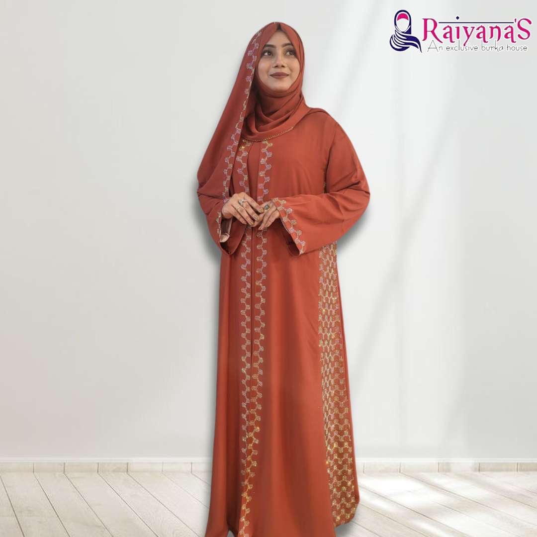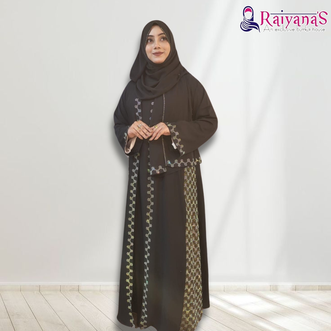 Inspired by the serene beauty of twilight, this borka is adorned with subtle floral embroidery and delicate stone accents. The flowing silhouette and rich details make it a perfect choice for formal occasions or religious celebrations.